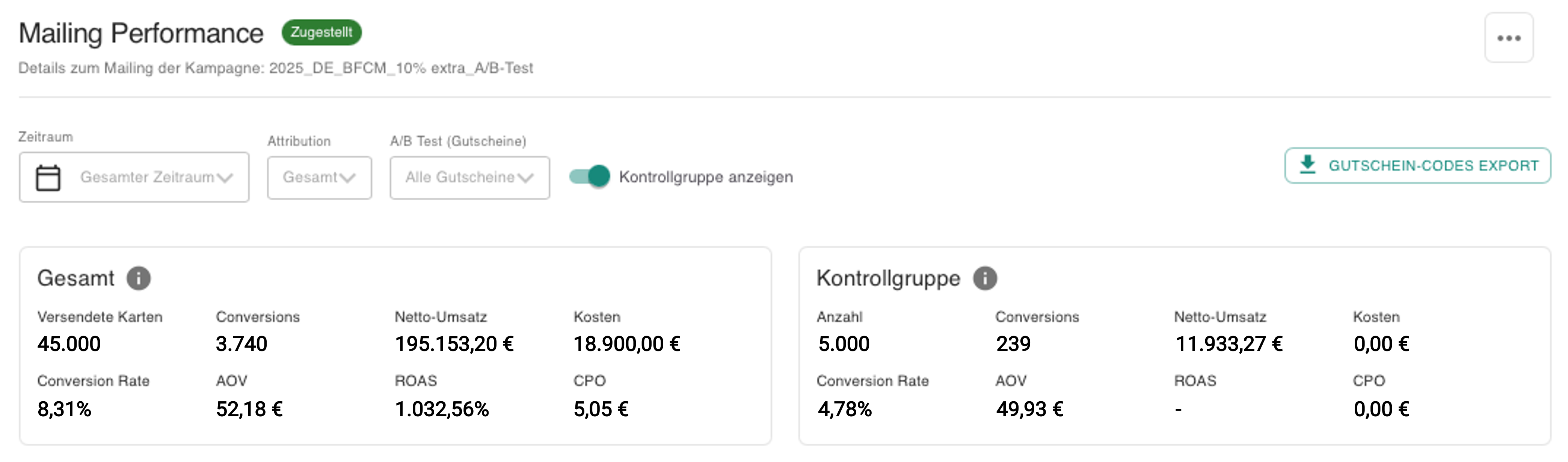 Für Kampagnen außerhalb starker Promotions sind Gutscheineinlösungen oft eine solide Näherung an das Kontrollgruppenergebnis, so wie im obigen Beispiel. In intensiven Promo-Phasen wie BFCM verändert sich das Bild jedoch deutlich: Die Gutscheineinlösung unterschätzt dann regelmäßig den tatsächlichen Kampagneneffekt. Das Mailing aktiviert den Kunden zwar – der Abschluss erfolgt aber über einen anderen Kanal oder einen anderen Gutschein, der gerade prominenter beworben wird. Genau in solchen Situationen öffnet sich die Lücke zwischen Gutschein-Attribution und echtem inkrementellem Uplift besonders klar.